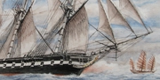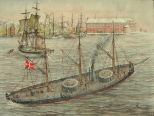 Panzerschiff „Rolf Krake“wurde von Cowper Phipps Coles einem fortschrittlichen Marinearchitekten aus Glasgow konstruiert. Auftraggeber war die dänische Admiralität. „Rolf Krake“ war das erste völlig aus Eisen gebaute Panzerschiff mit zwei Geschütztürmen. Kiellegung 1862, Stapellauf 1863, Länge über alles 183´, größte Breite 38´2“ mit einem Tiefgang von 10´6“. Der geringe Tiefgang ermöglichte ein erweitertes manöverieren in den oft flachen Gewässern zwischen den dänischen Inseln. Im II. Krieg um Schleswig erfolgte der erste Einsatz in der Vemmingbucht und im Alsfjord gegen die vorrückenden preußischen Truppen. Die Bilder zeigen das Panzerschiff beim Auslaufen aus Sonderborg. An der Steuerbordseite wird mit dem Abklappen der Reeling begonnen um den Geschützen freies Schußfeld zu geben. In der Vemmingbucht wurde die Pontonbrücke beschossen welche die Batterien der Preußen mit Egernsund verband. Beschossen wurden auch die Sturmparallelen vor den Düppeler Schanzen. Die Preußen antworteten mit den auf der anderen Seite der Bucht aufgestellten Batterien. Beim Bau des Schiffes wurde davon ausgegangen, daß der Gegner auf gleicher Höhe mit dem Schiff liegt. Die geringe Deckshöhe bot nur eine schmale Angriffsfläche. Die an der Küste höher liegenden preußischen Batterien schossen schon wegen der größeren Entfernung balistisch und trafen das geringer gepanzerte Deck von „Rolf Krake“ Der Leutnant Jespersen fiel und drei Mann der Turmbesatzung wurden verwundet, damit war ein Geschützturm ausgefallen. Am 29. Juni 1864 um 2 Uhr begannen die Preußen mit 600 Booten zwei Diffisionen mit Kavallerie und Artillerie über den Alssund zu setzen. „Rolf Krake“ sollte dies verhindern. Der Übergang wurde von preußische Batterien an Land gedeckt. Schwere Kanonen eignen sich wenig für kleine Ziele so drehte Kapitän Peter Rothe ab da er den Übergang wegen der Vielzahl der Boote nicht verhindern konnte. Weitere Bildbeispiele |