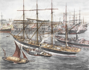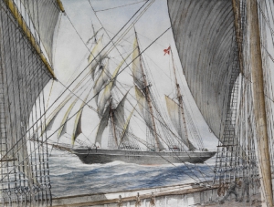 Viermastbark „Polymnia“ vor Kap HoornDas Schiff wurde aus Eisen gebaut, es vermaß 2 129 BRT Polymnia war das erstes in Deutschland gebaute Viermastvollschiff. Am 10. März des Jahres 1886 wurde der Segler an die Reederei B.Wencke Söhne geliefert. Das schnelle Schiff hatte den klassischen Mastbau, Mast, Marsstenge, Bram-u. Royalstenge mit ungeteilten Bramsegeln. Unter den Kapitänen V. Diedrichsen, G. Schmidt, M. Ipland, A. Molzen und Albert Schellhaß machte sie Reisen nach Nord- und Südamerika sowie Australien. Sie hatte das Unterscheidungssignal RGWD. 1896 wurde der Kreuzmast, aus Ersparnisgründen durch einen Schonermast ersetze und das Schiff damit zur Viermastbark. Am 30. Januar 1906 wurde Polymnia an die Rhederei Akt.-Ges. vom 1896 verkauft. Am 10. März 1907 strandete der Segler auf Baily Island bei Kap Hoorn. Von der Besatzung kam keiner zu Schaden, doch das Schiff ging total verloren. Die Polymnia hat für die Überfahrt von Hamburg nur wenig Ballast geladen und für die Stabilität die Royalrahen an Deck genommen. Dänische Schonerbark als BeispielErbaut etwa 1870 auf einer dänischen Werft aus Eiche. Das Bild ist ein Schiffsportrait und zeigt die Schonerbark von Backbord vorlich. Der Blick geht über das Deck, Fock- und Großsegel eines stählernen Schiffes um die Jahrhundertwende. Das vermutlich als Viermastbark getakelte Stahlschiff ist durch seine Größe und die stabile stählerne Takelage schneller als der hölzerne Segler. In seiner Manövrierfähigkeit ist das alte Schiff unübertroffen und kann selbst kleine Häfen ohne Schlepperhilfe anlaufen. Meist mit privaten Eignern sind diese Schiffe bis in den zweiten Weltkrieg hinein gesegelt. Weitere BildbeispieleBesuchen Sie meine private Ausstellung. |